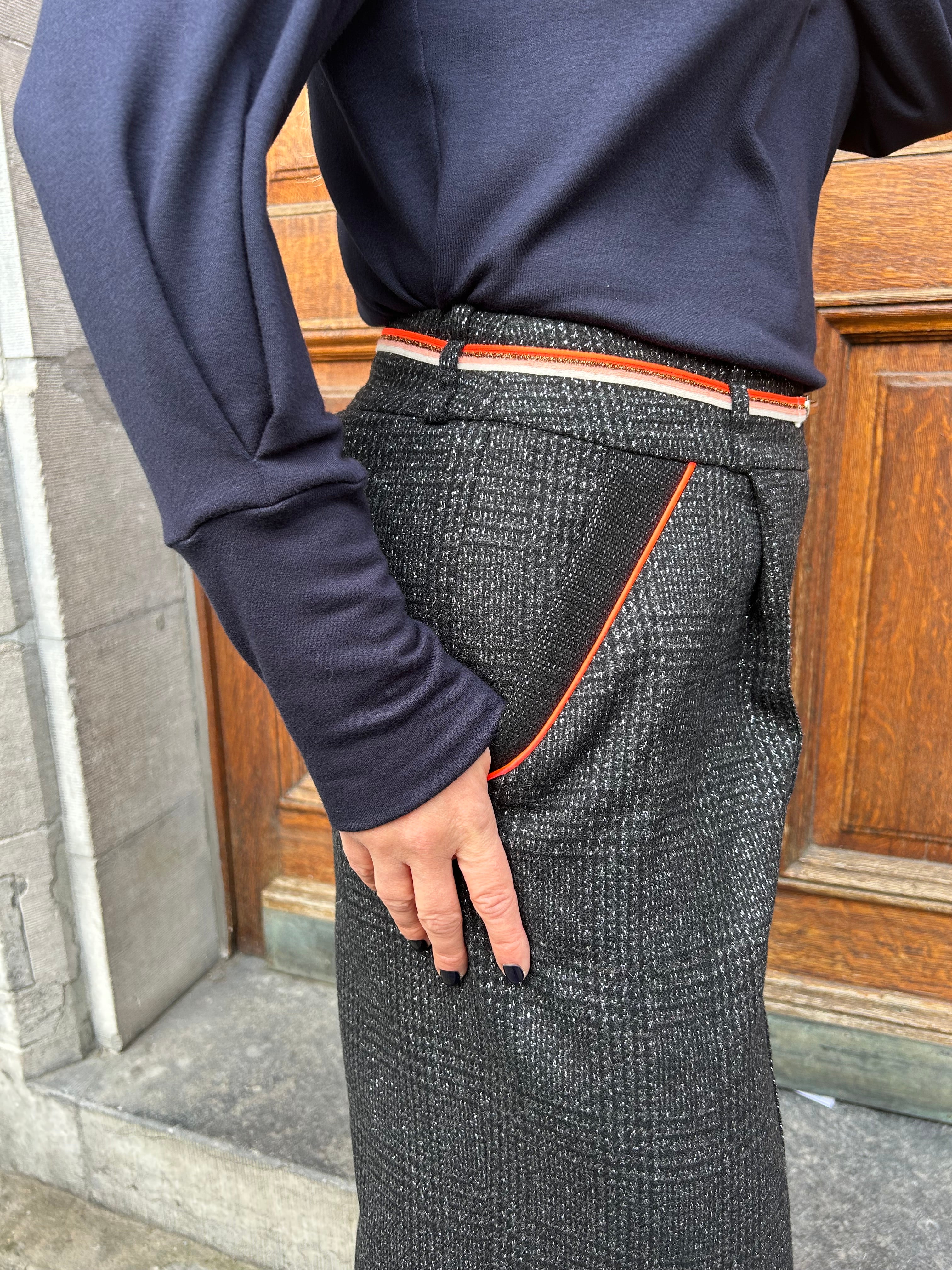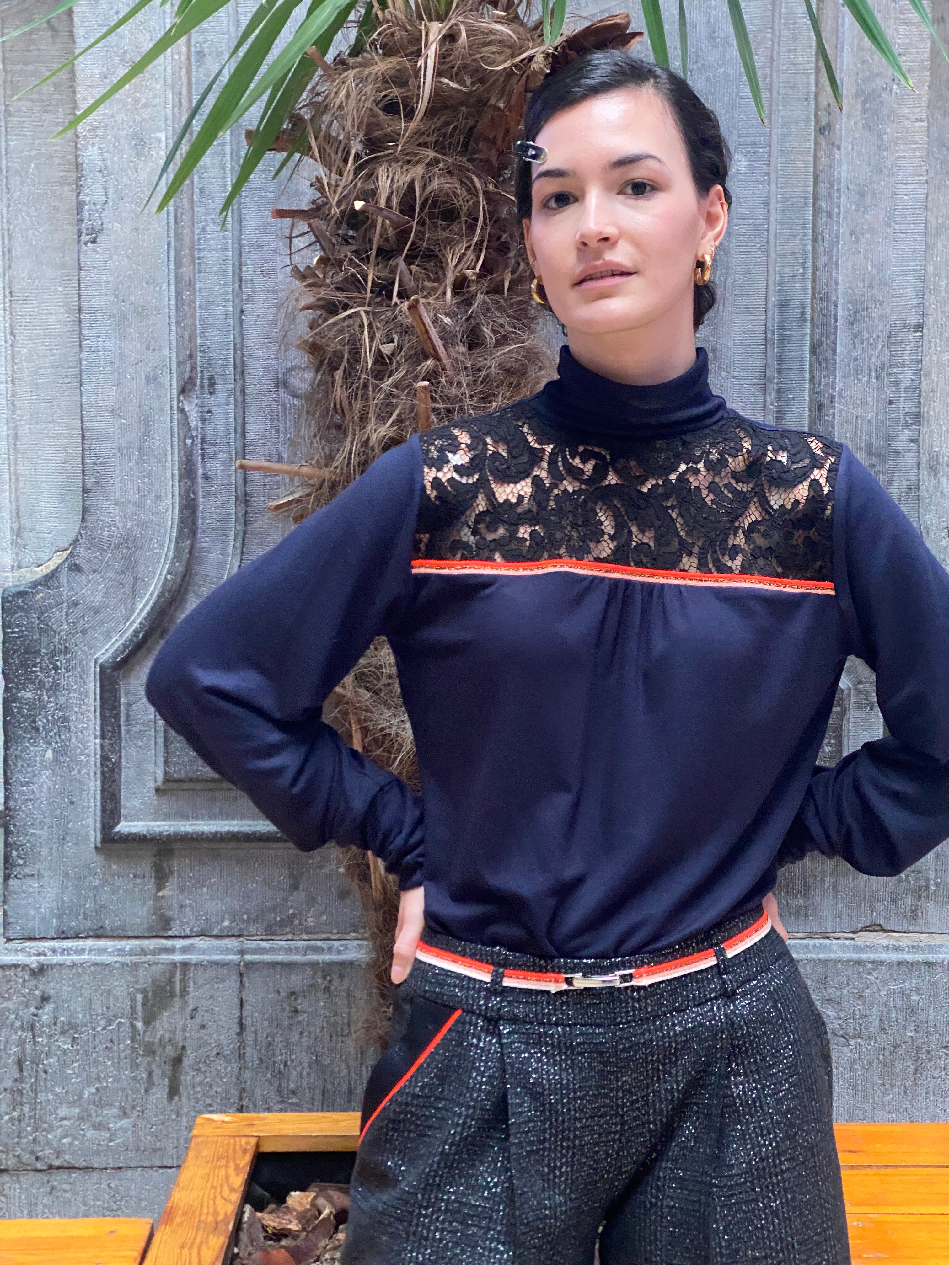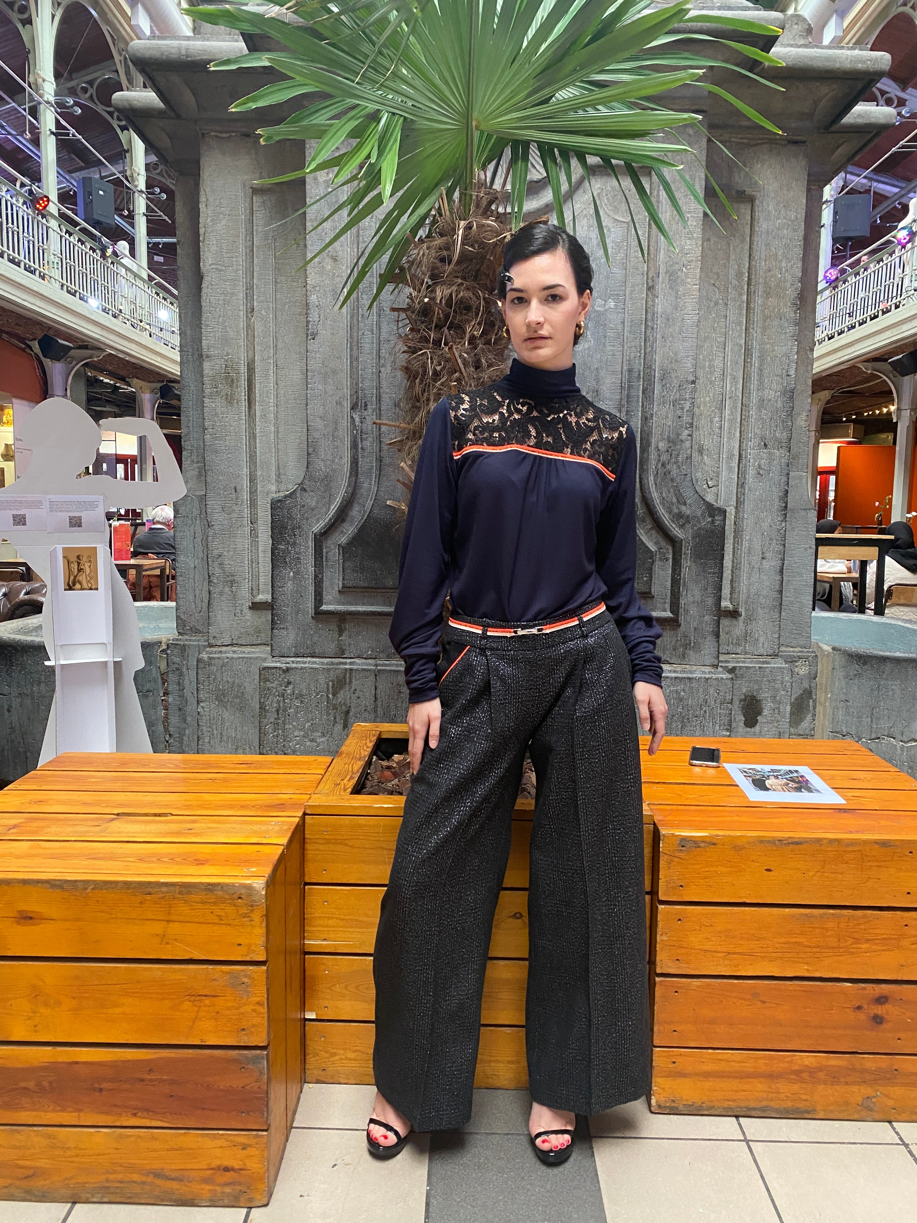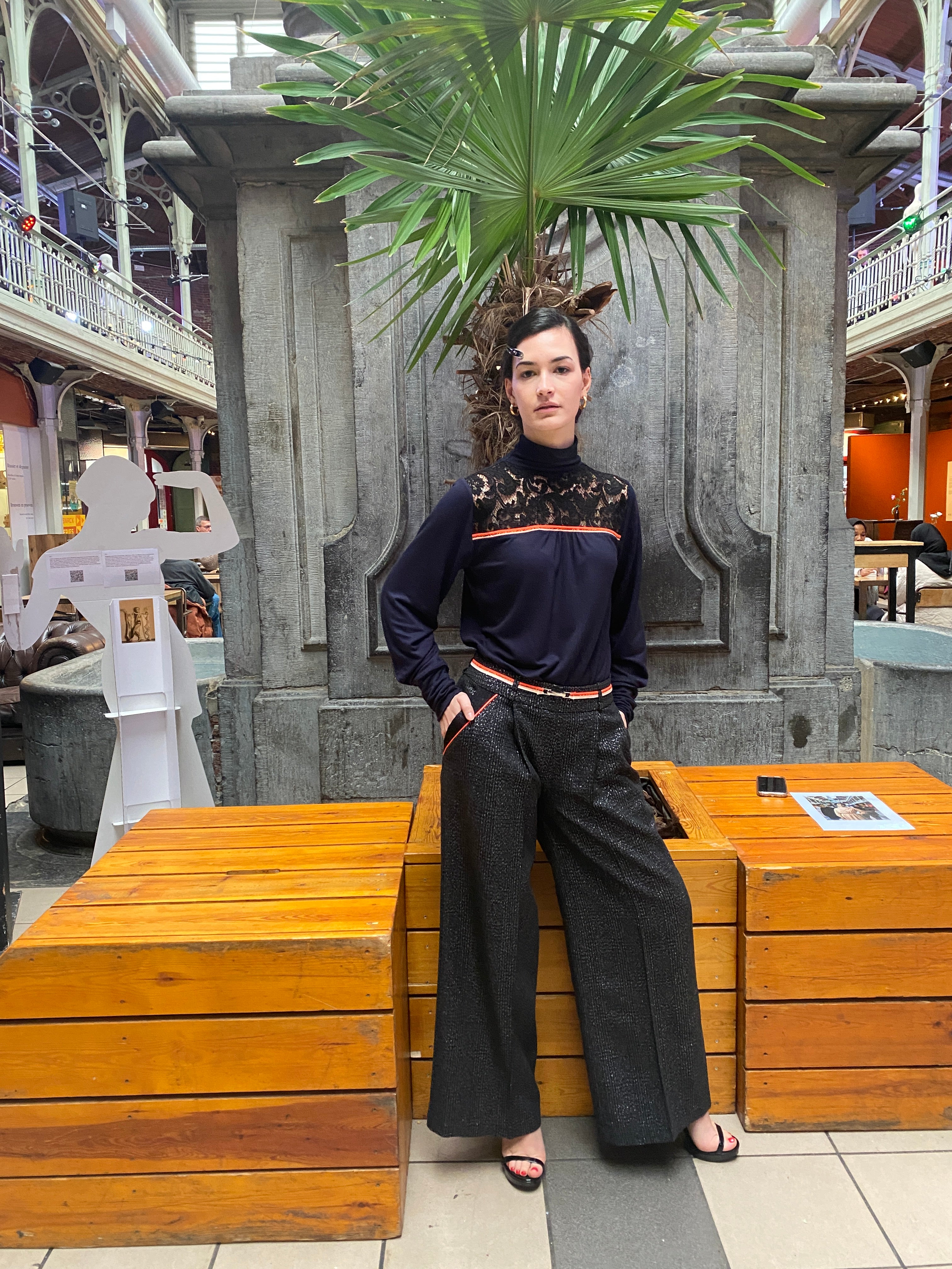 Finishing the piece is a removable belt I designed and produced in France — off-white, neon orange, and copper lurex — an irresistible touch of playful shimmer ⚡