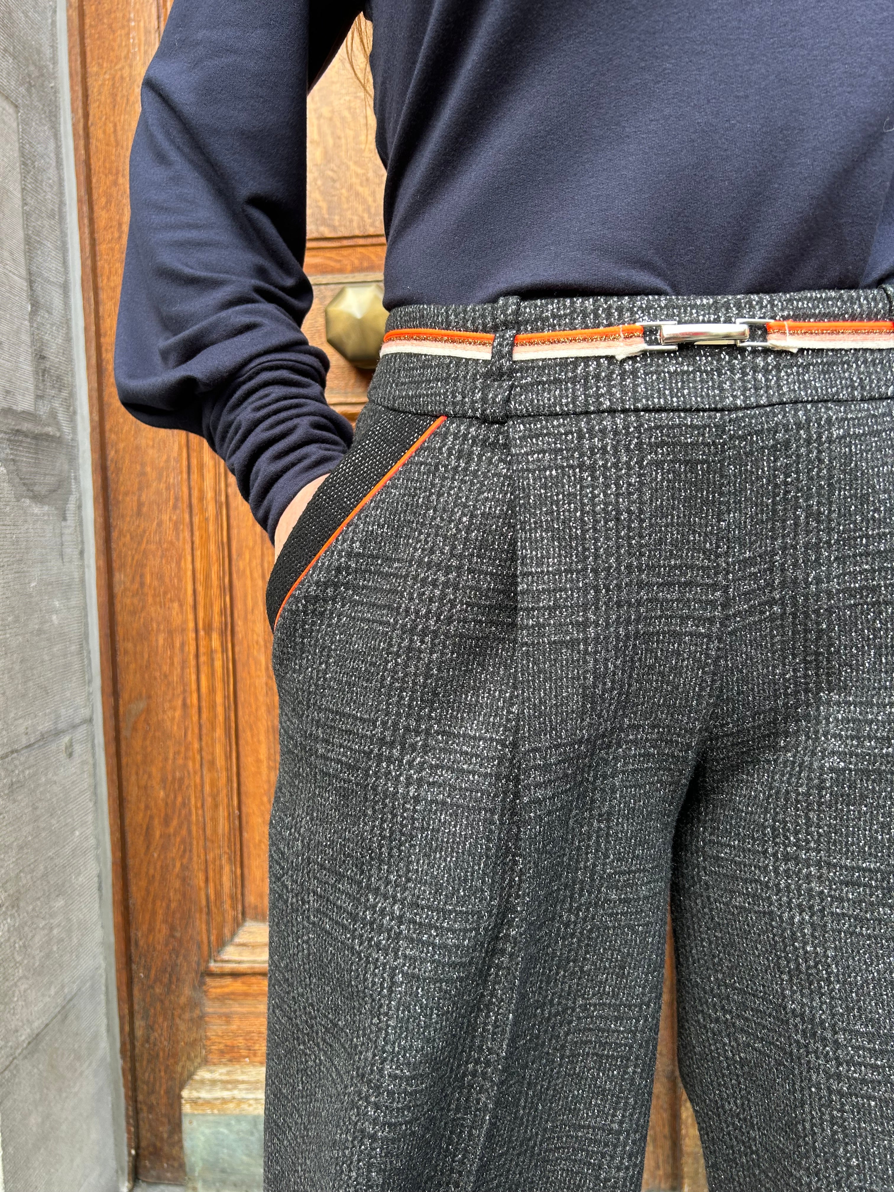 A blend of black, grey, and shimmering silver-gold lurex threads creates a quiet intensity: effortless sophistication with a mischievous twist.
