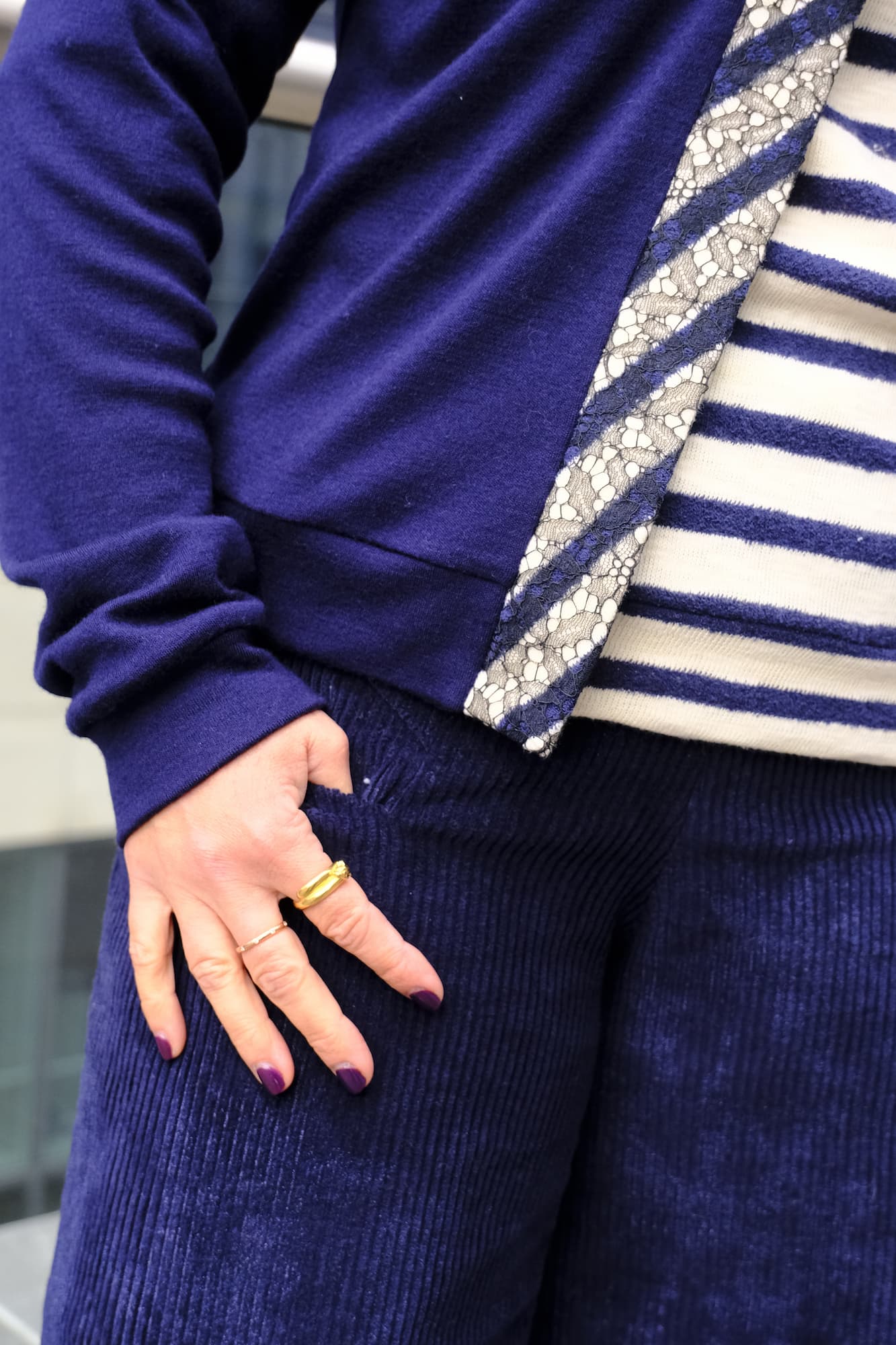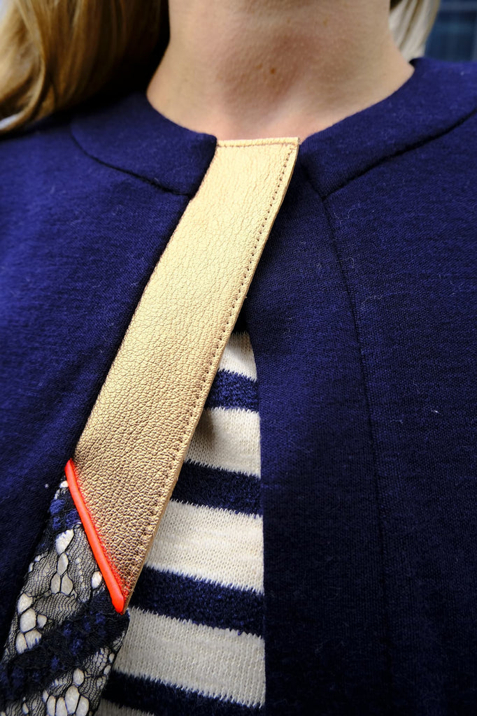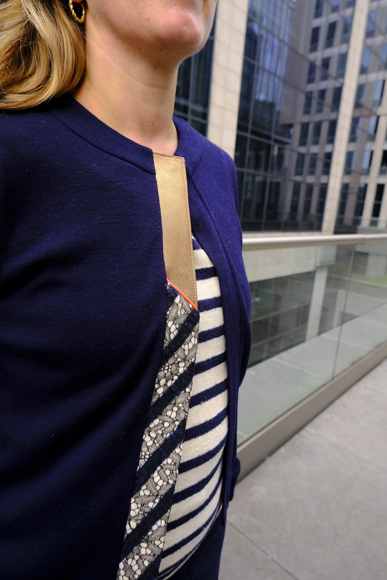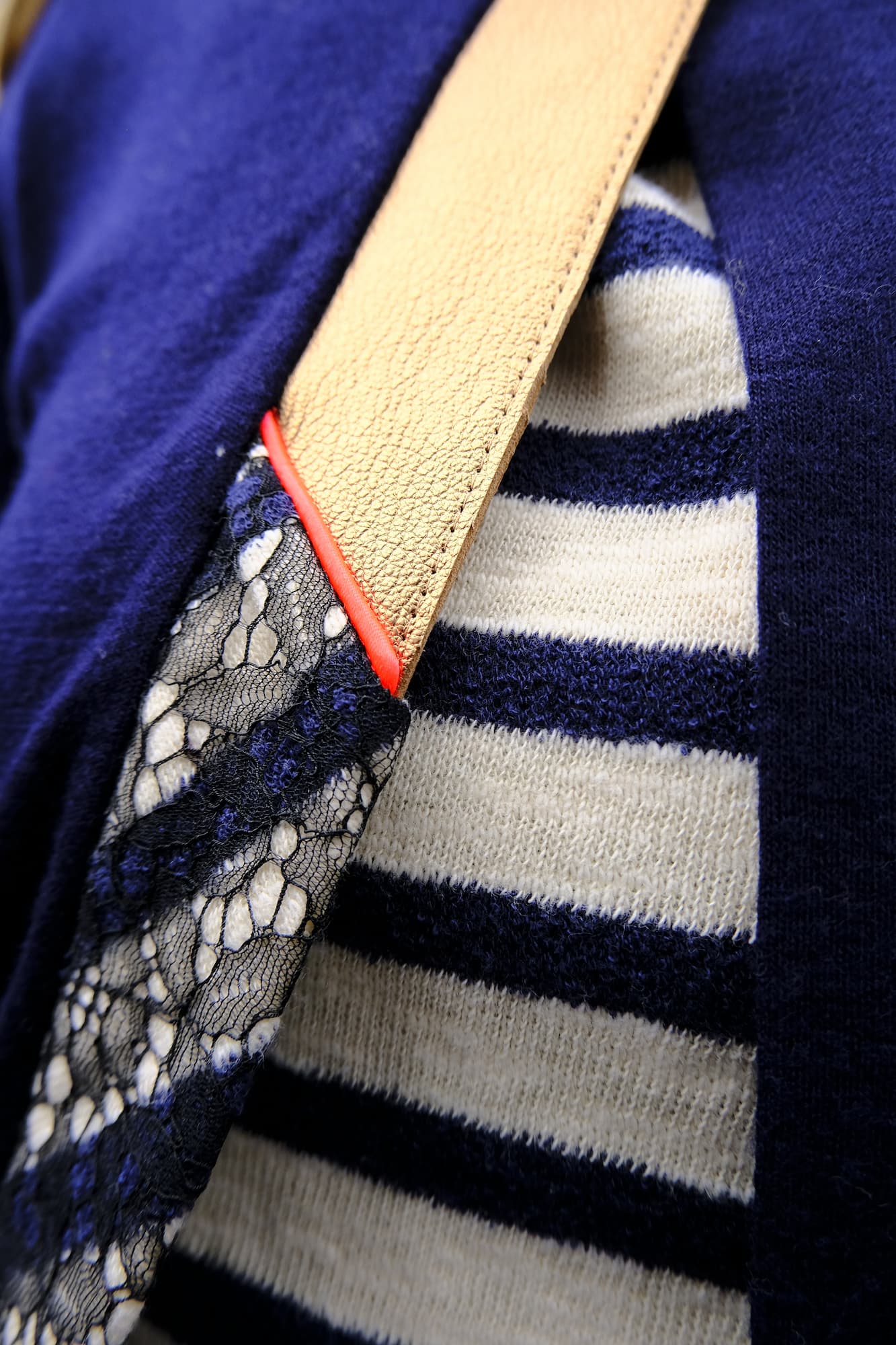 Dive into a luxury mix of textures: stretchy navy wool, golden leather accents, and delicate iced-black lace cotton from a haute couture Maison. 🌟