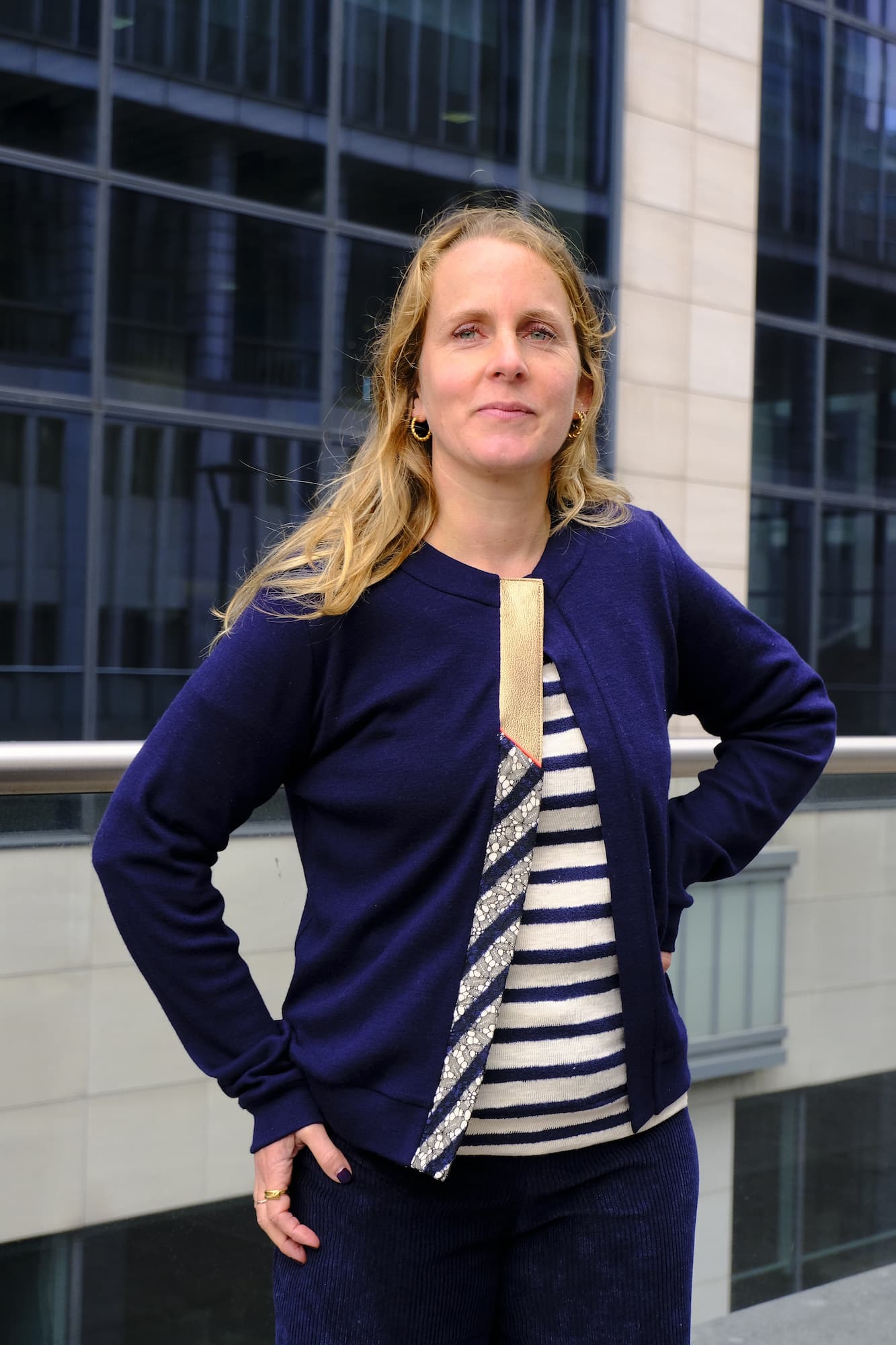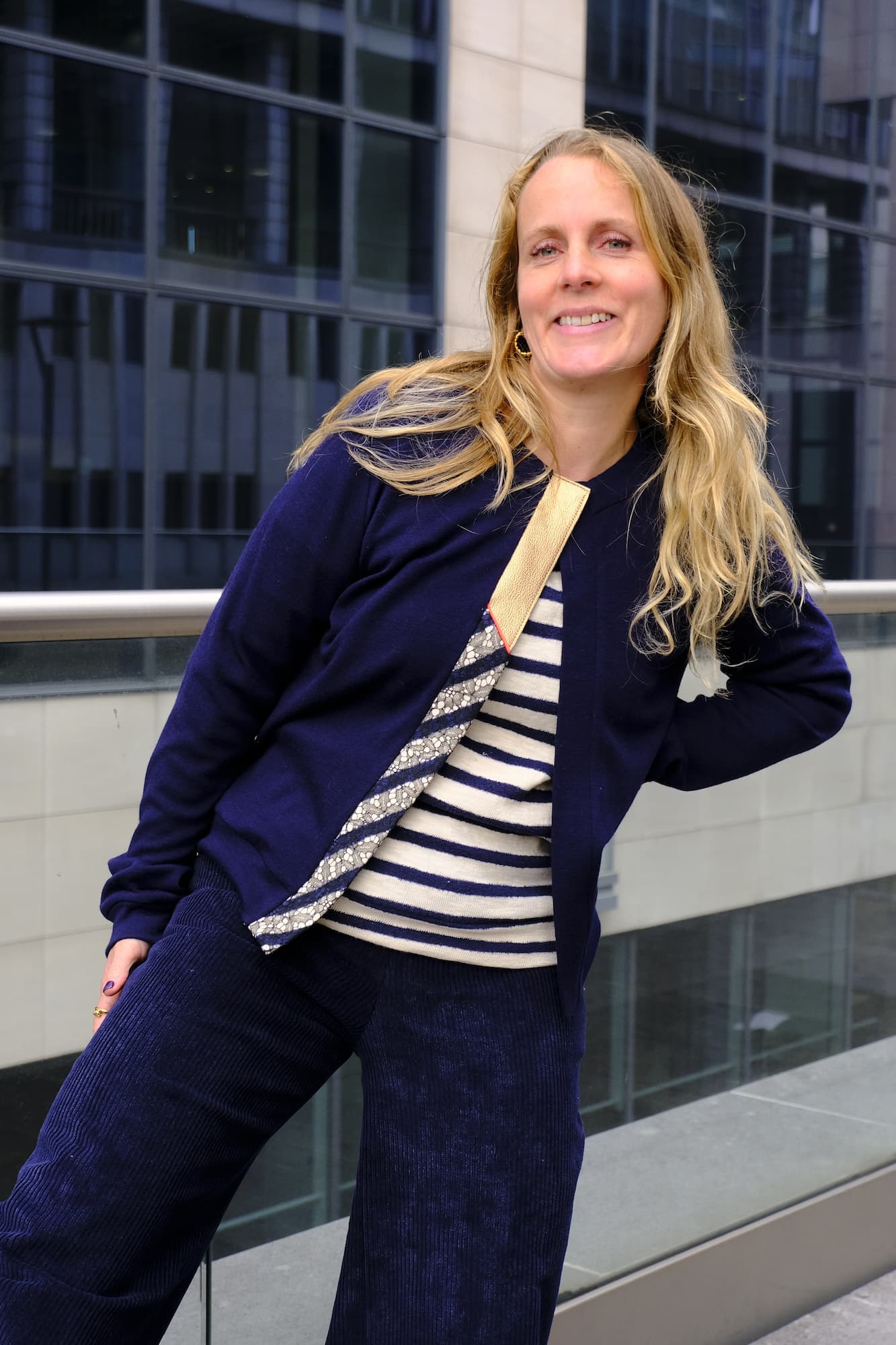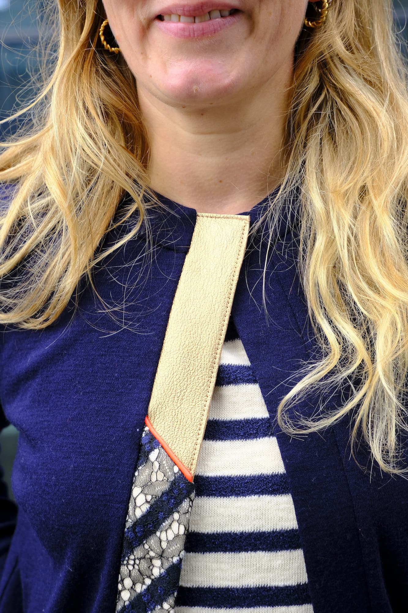 Dive into a luxury mix of textures: stretchy navy wool, golden leather accents, and delicate iced-black lace cotton from a haute couture Maison. 🌟