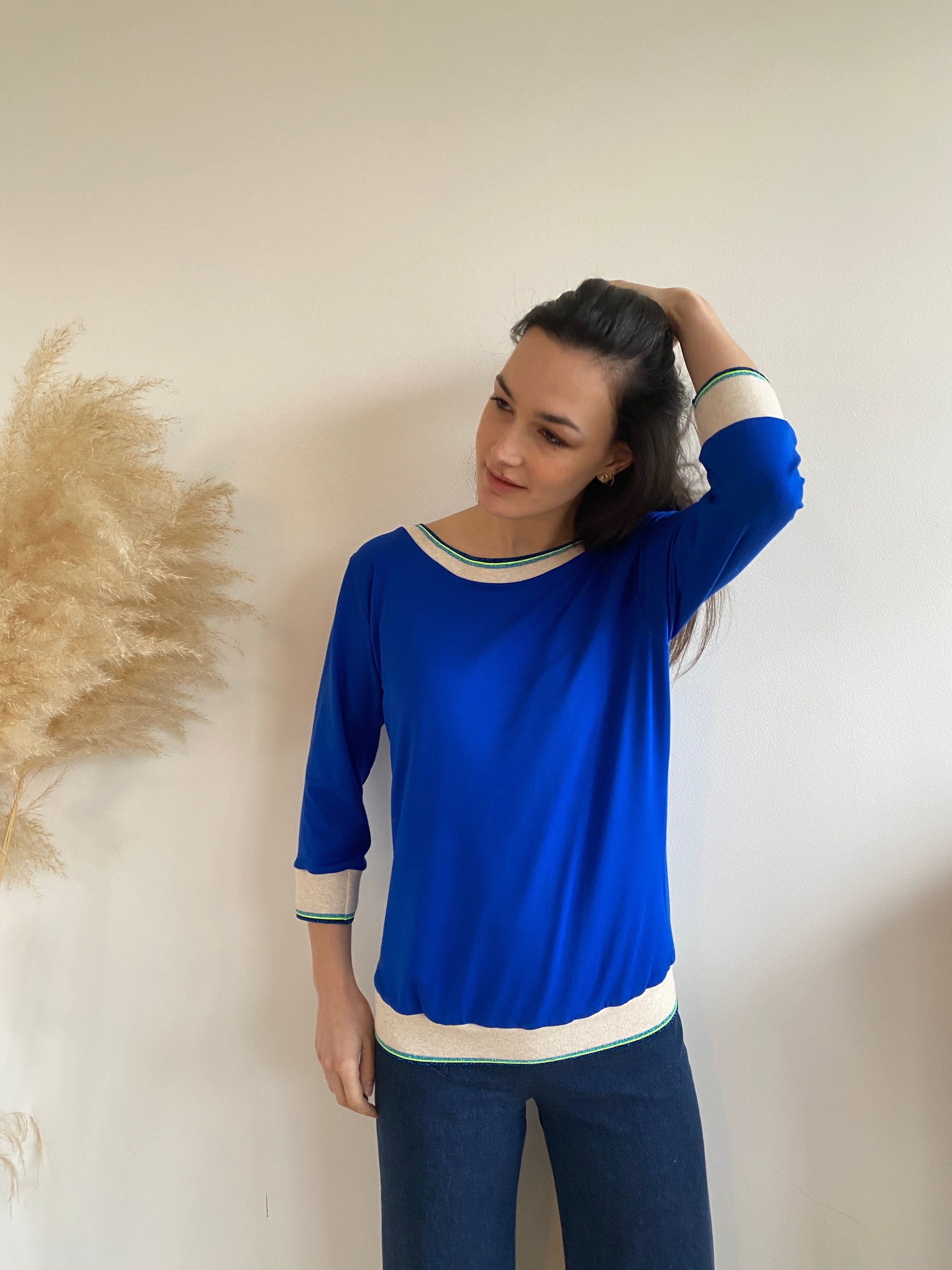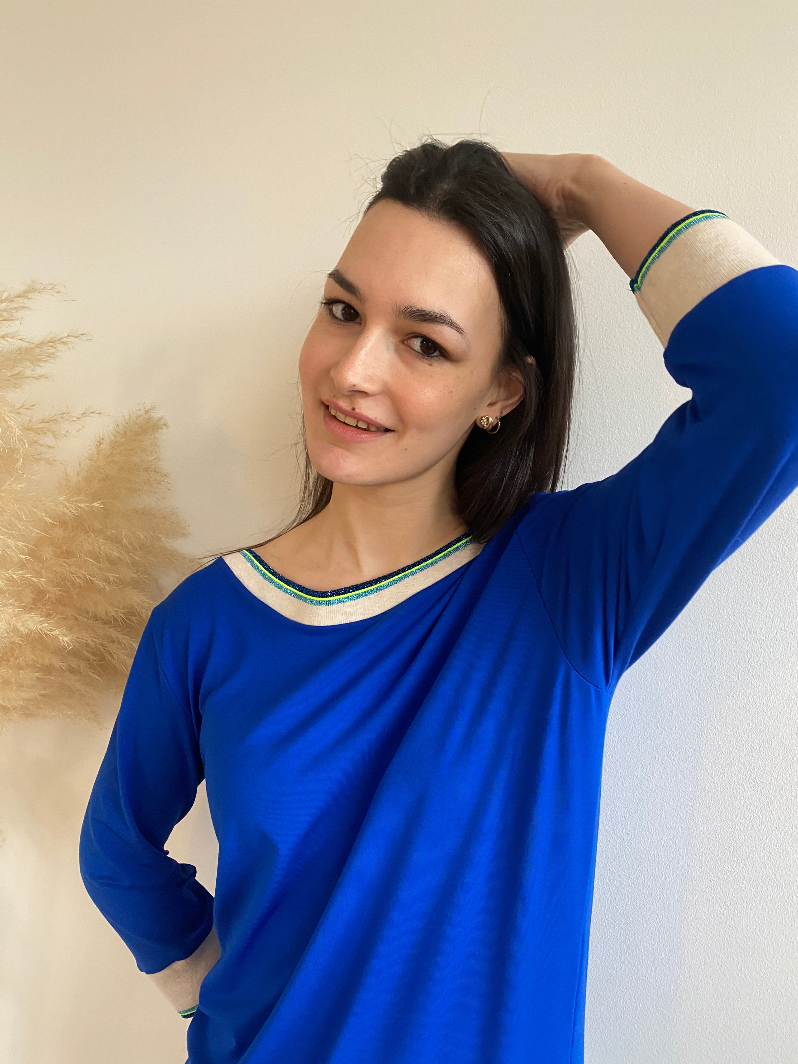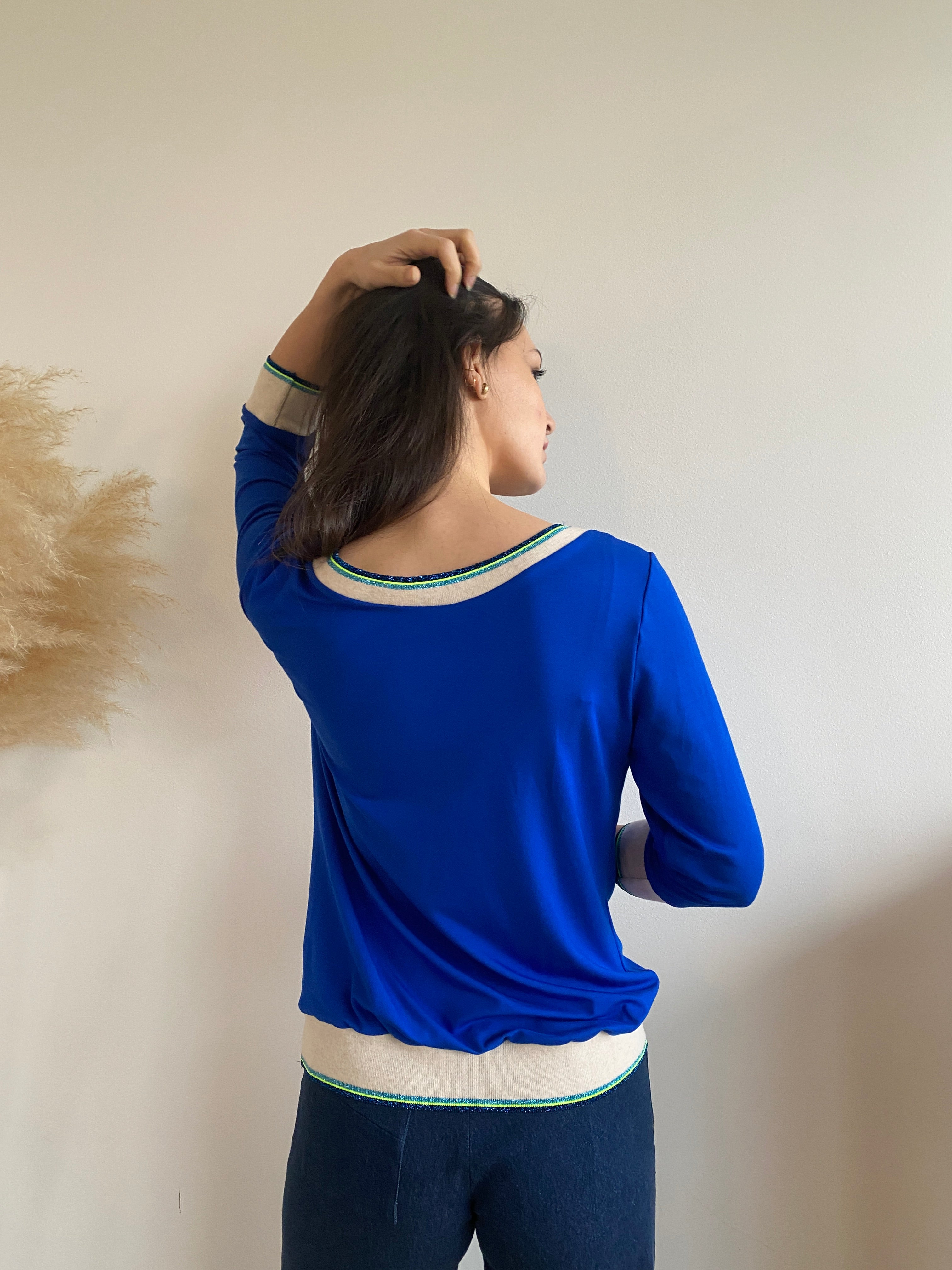 • Lovingly crafted in Brussels from electric blue viscose jersey , I paired it with my ribbing in ivory, lurex blue, and neon yellow ⚡💛✨ for that signature touch.