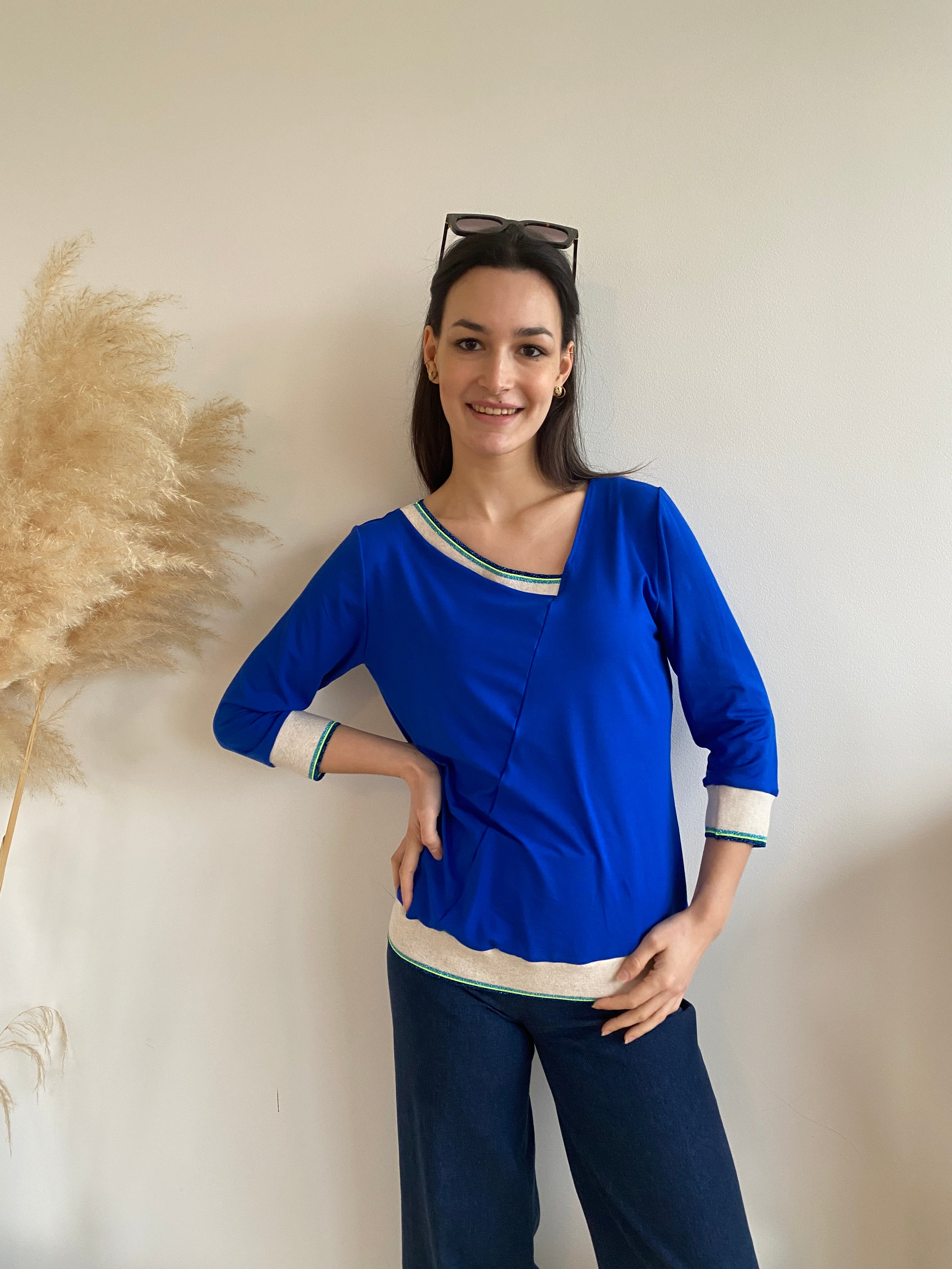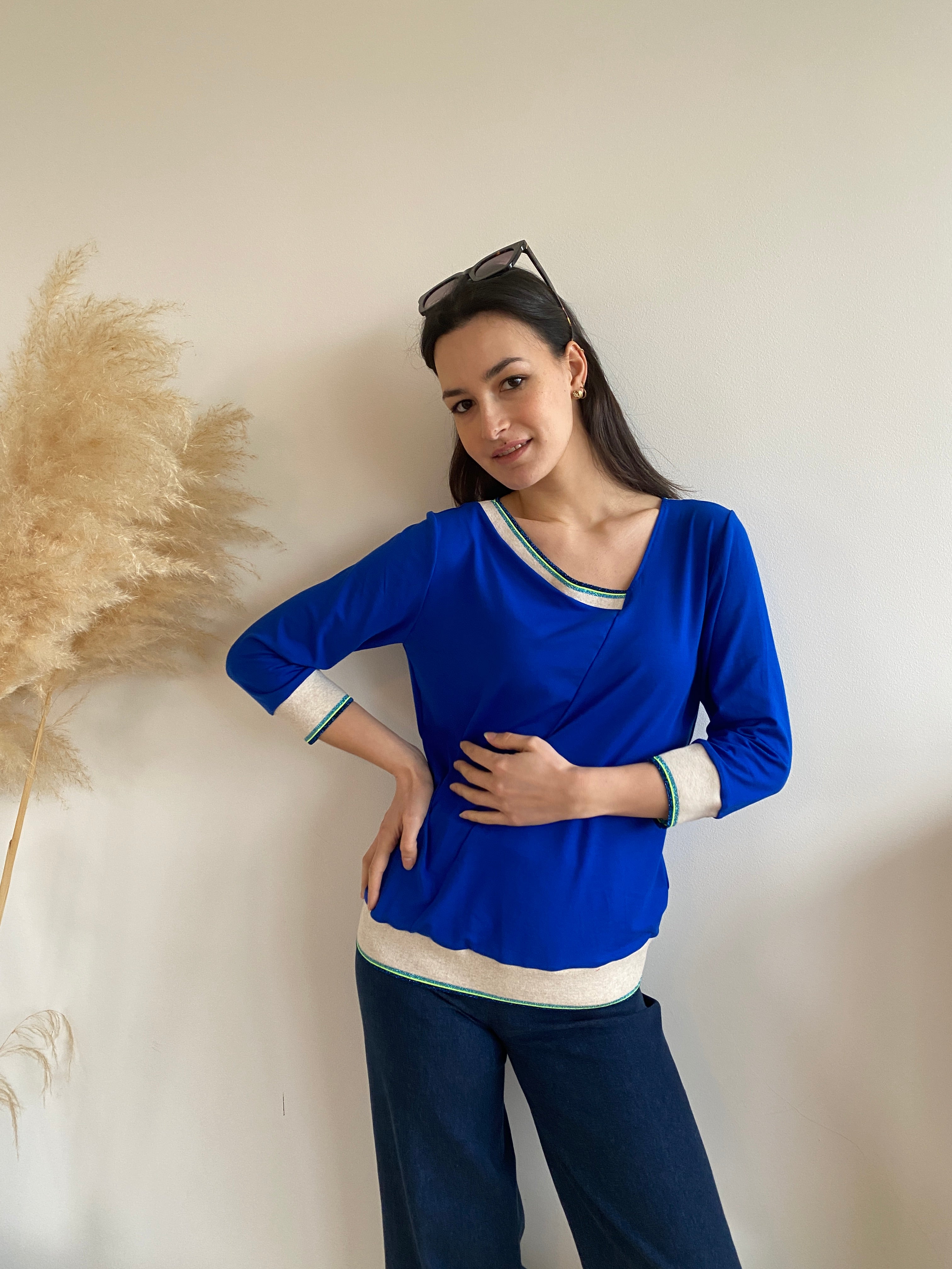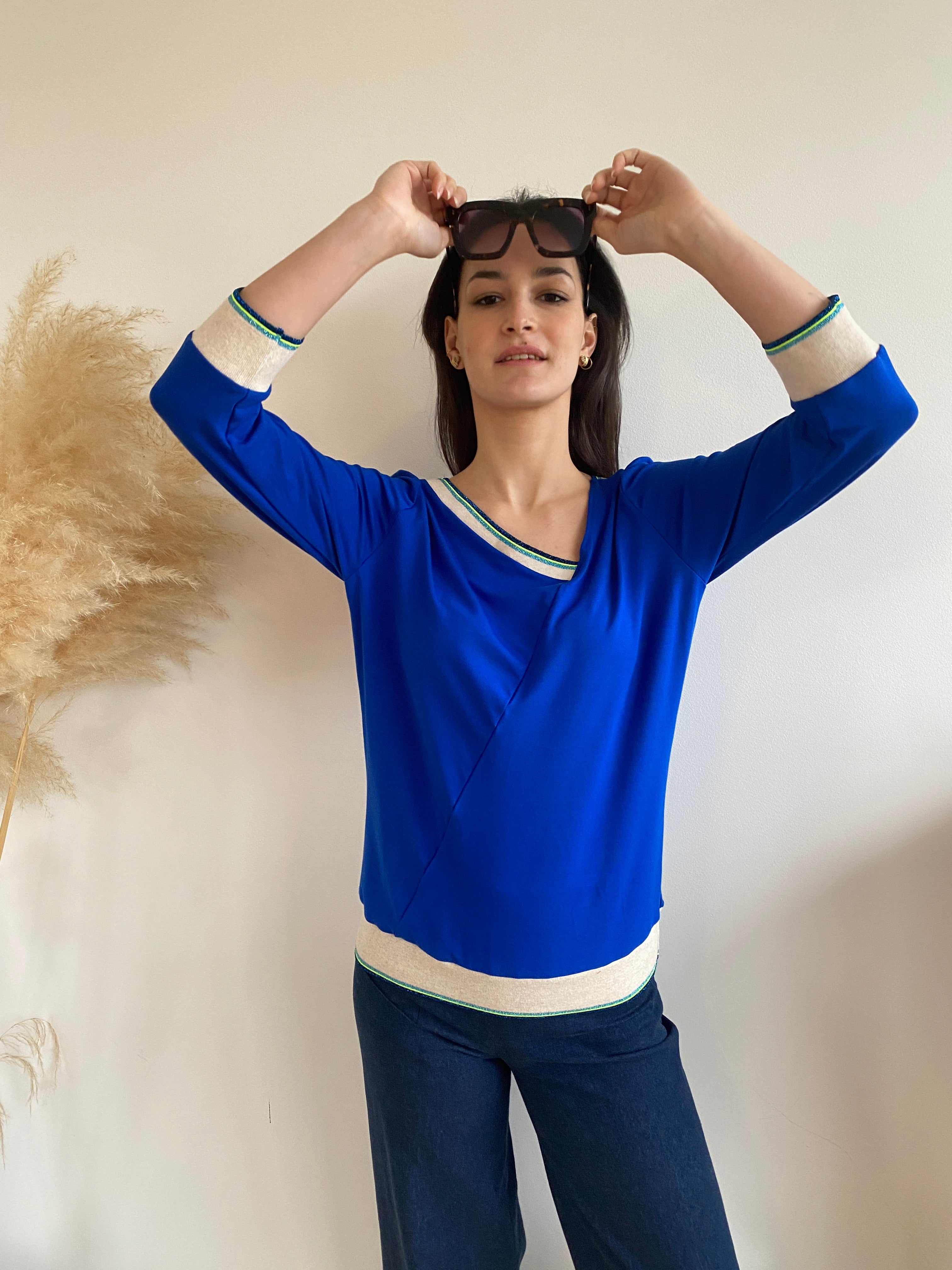 • Lovingly crafted in Brussels from electric blue viscose jersey , I paired it with my ribbing in ivory, lurex blue, and neon yellow ⚡💛✨ for that signature touch.