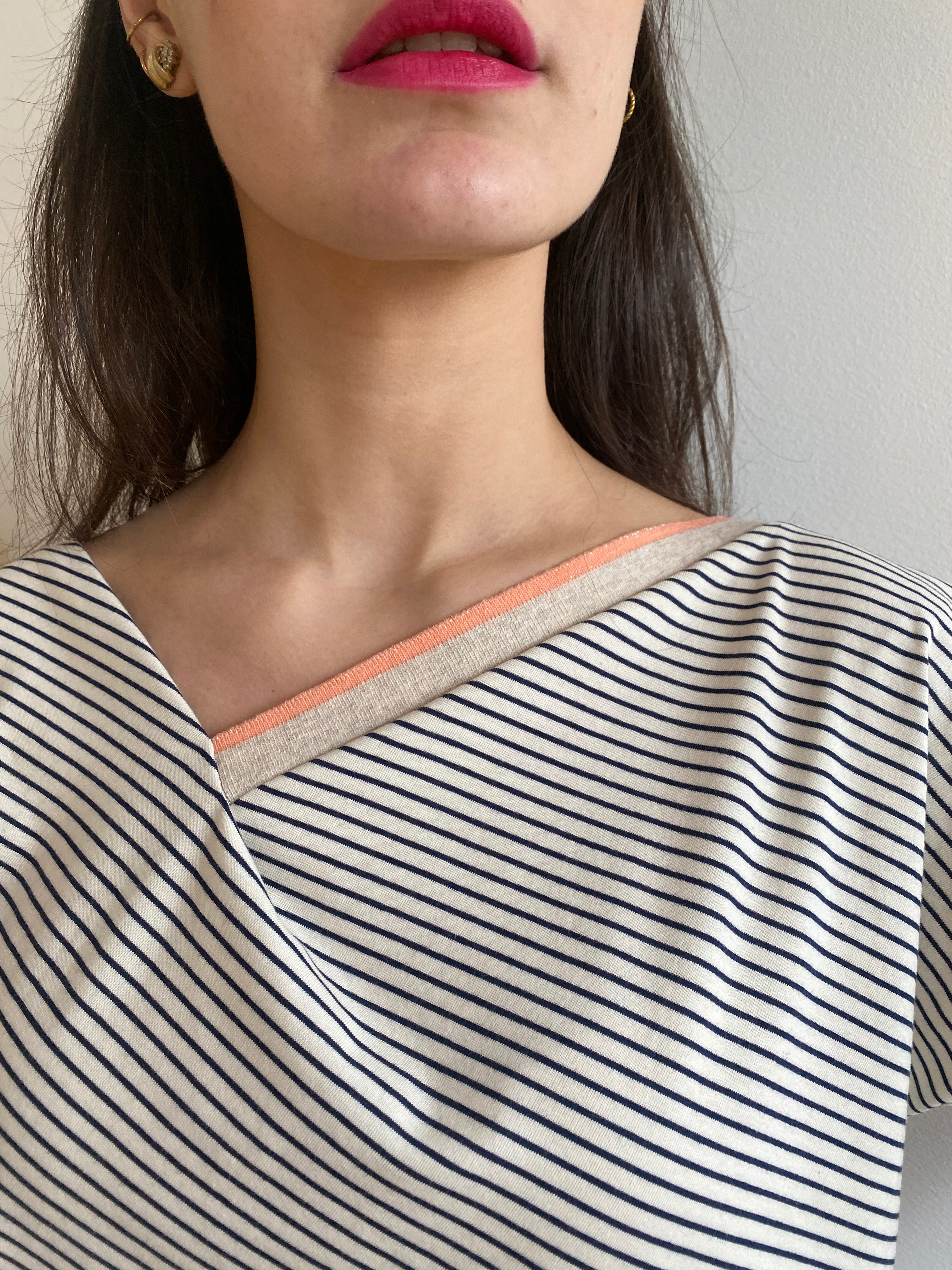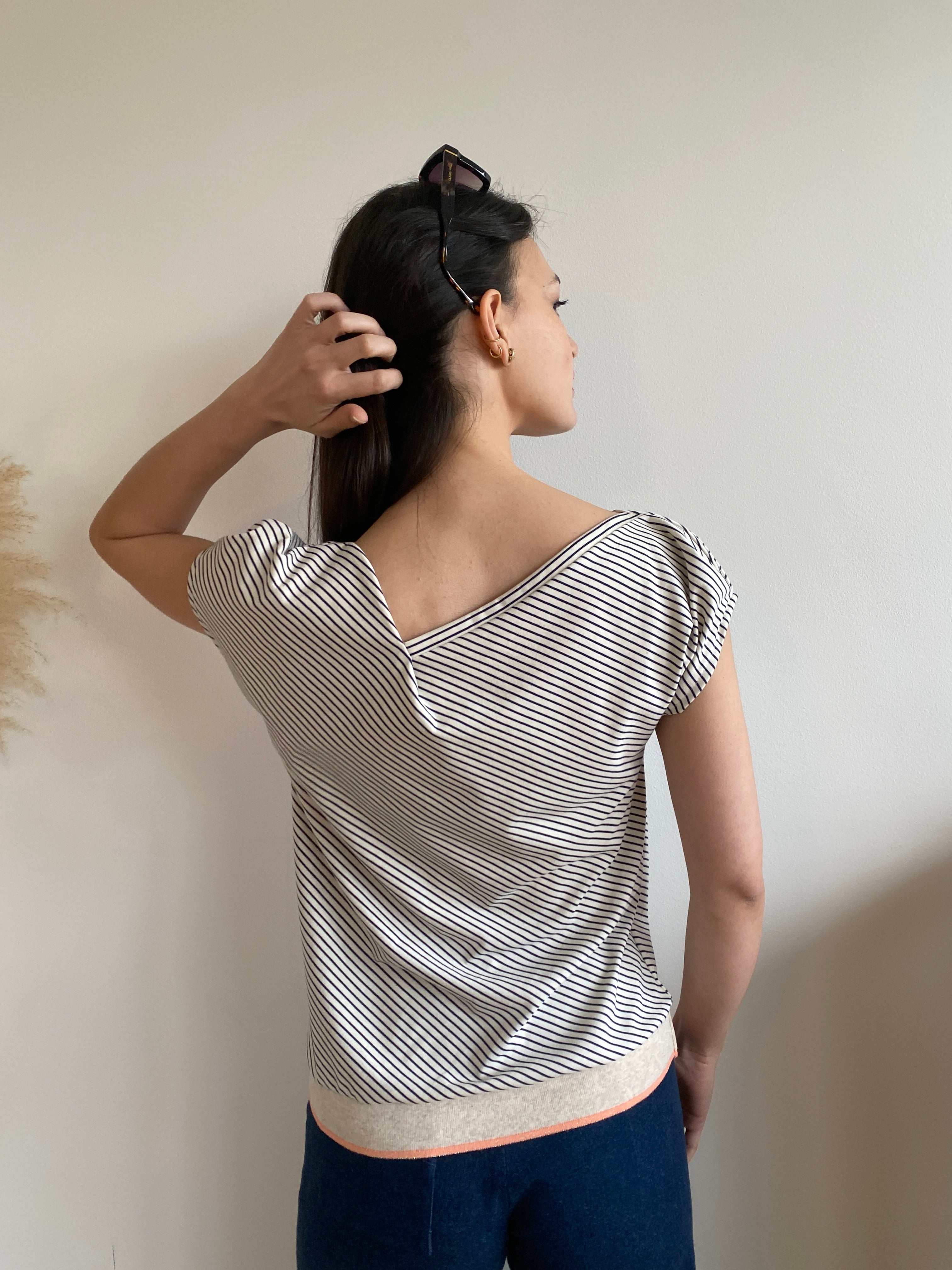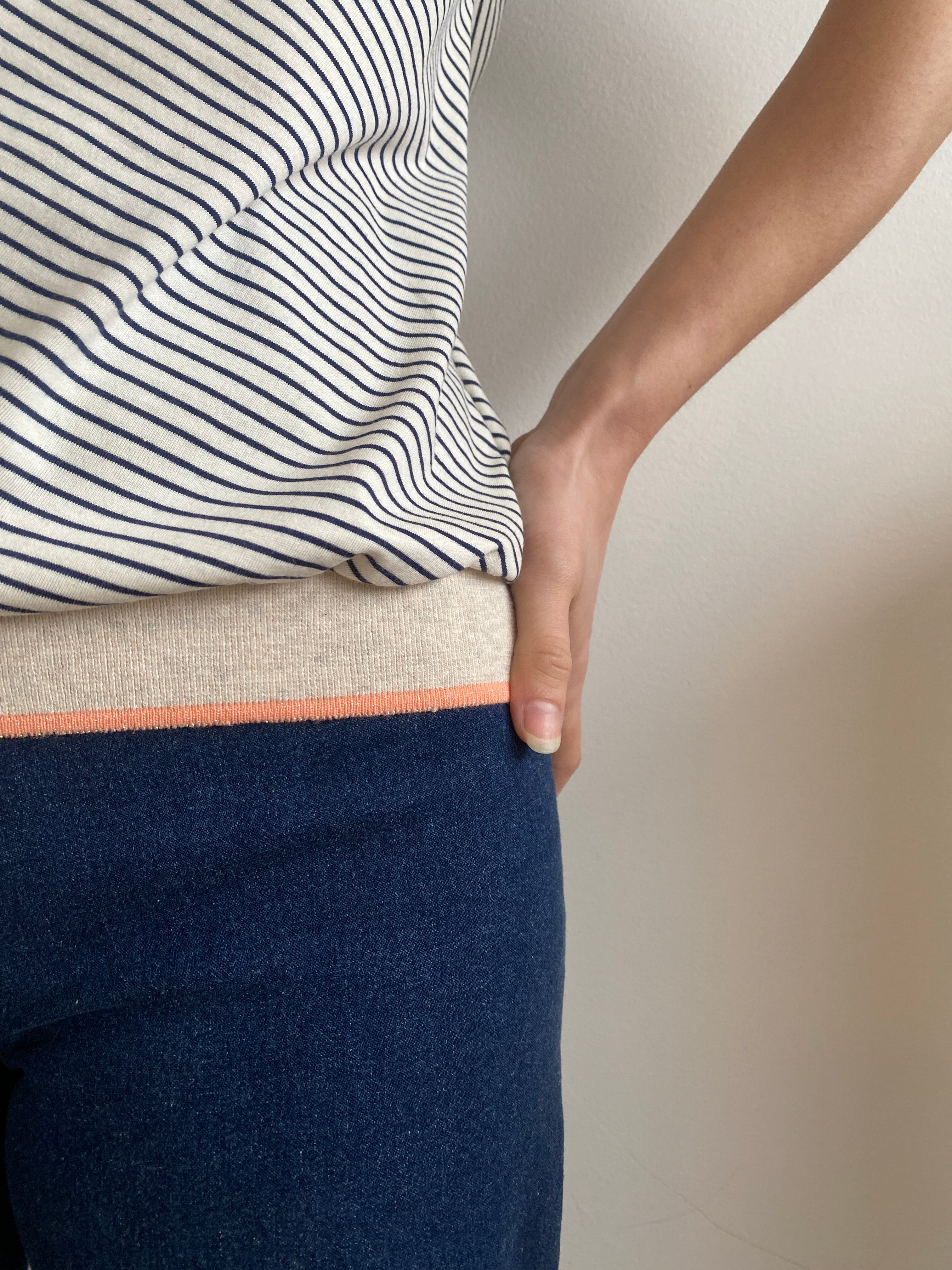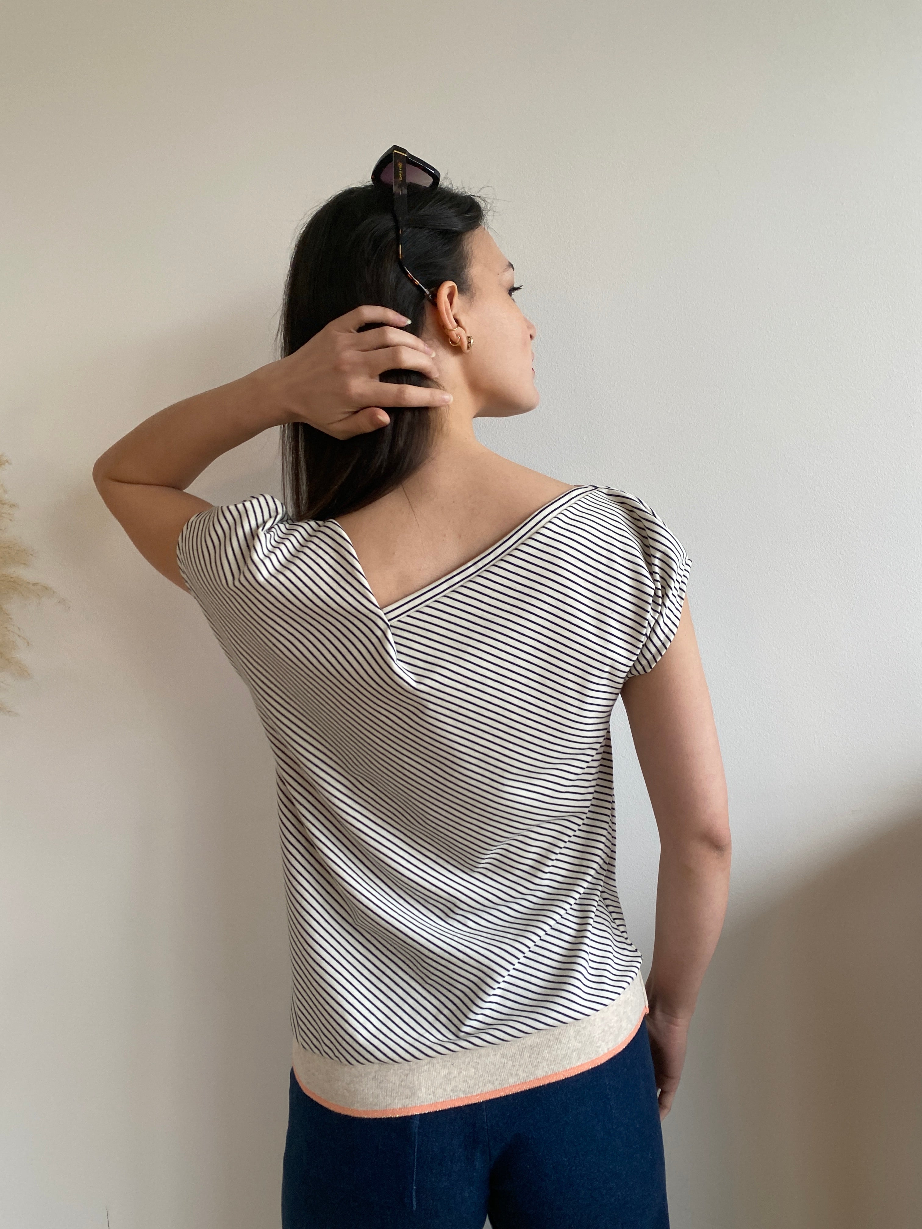 • Off white and navy blue striped marine slightly stretchy cotton jersey