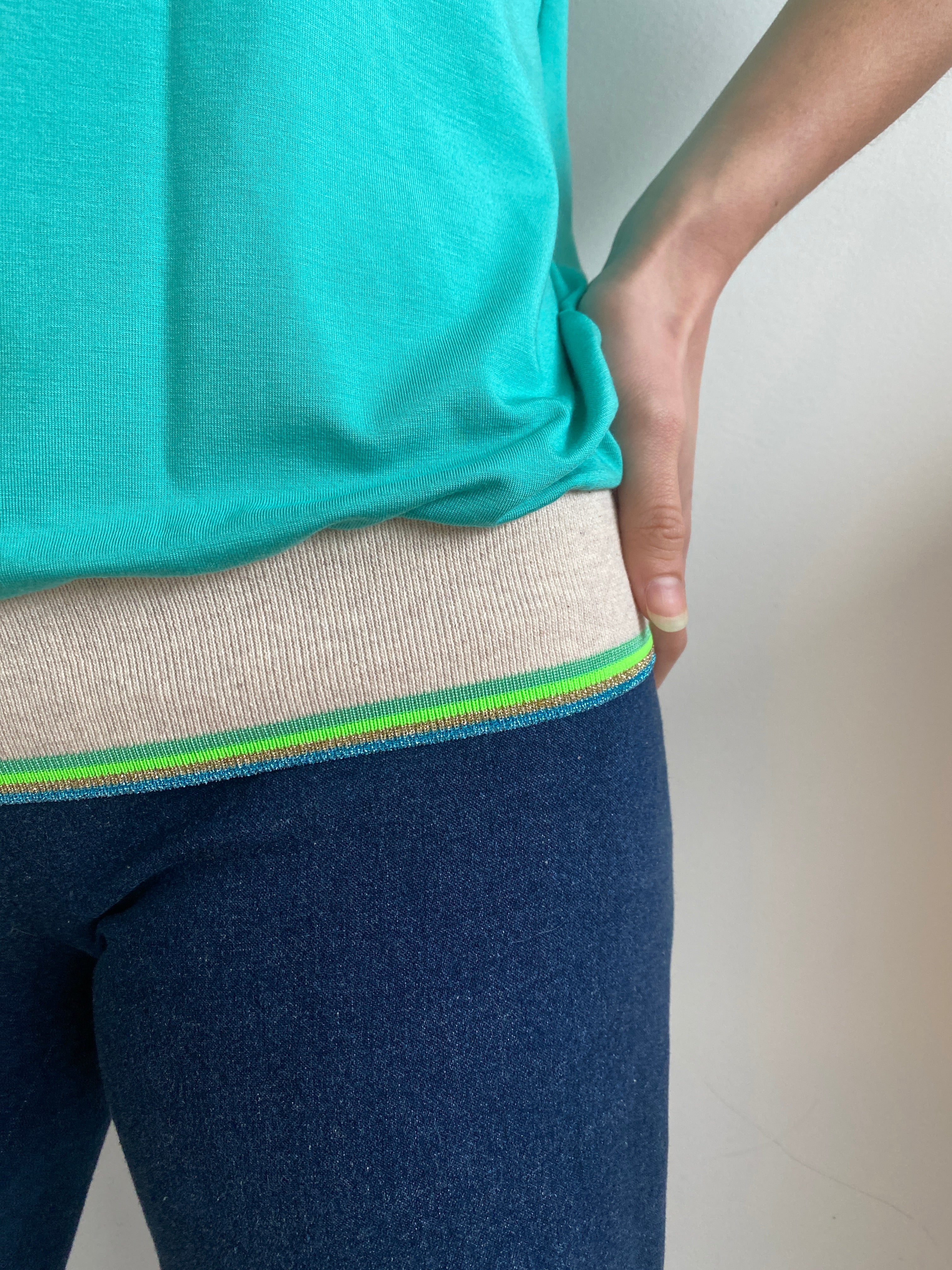 • Off white, neon green, lurex light blue rib