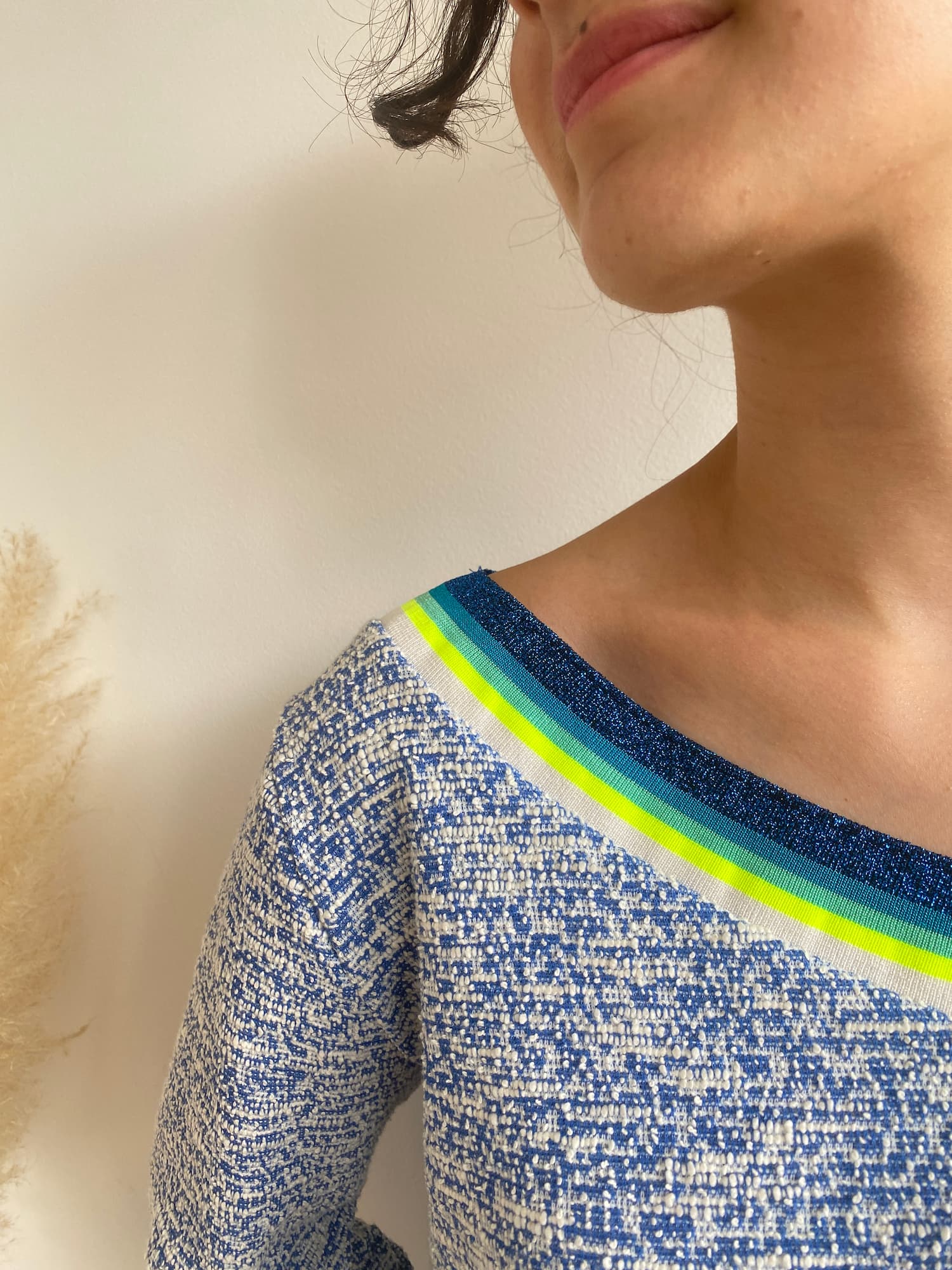 • Twisted asymmetrical-neck top on one side and boat neckline on the other side