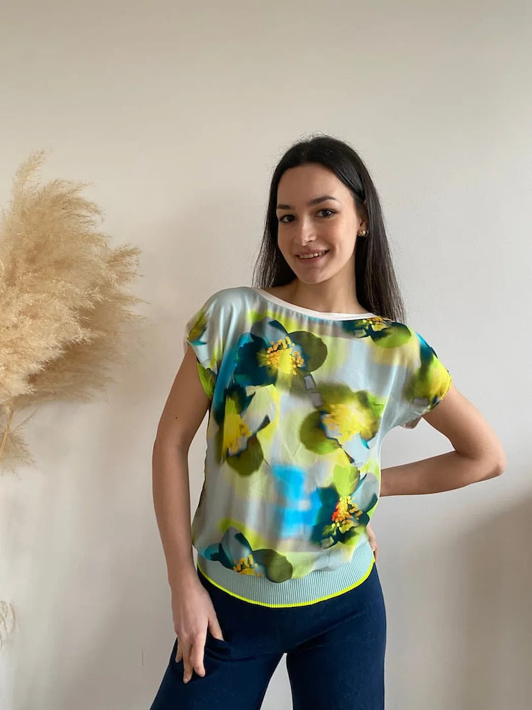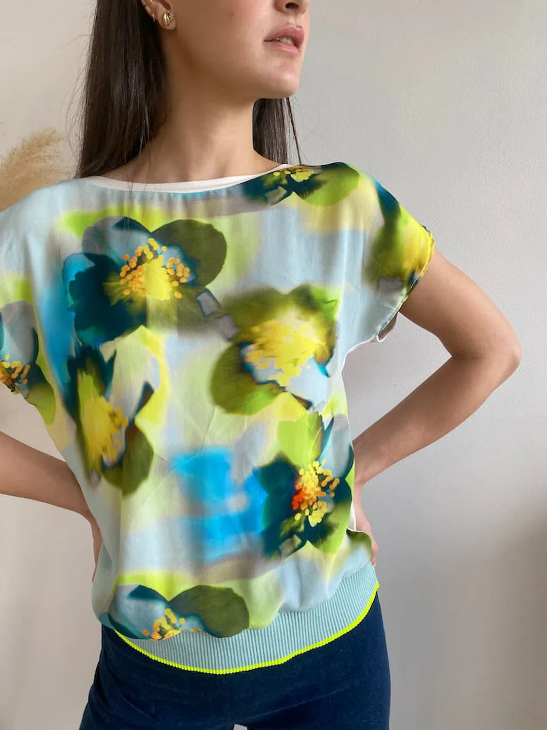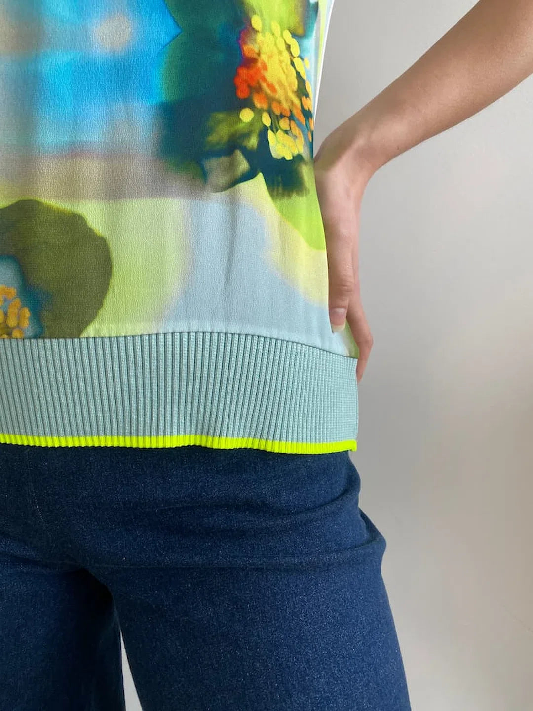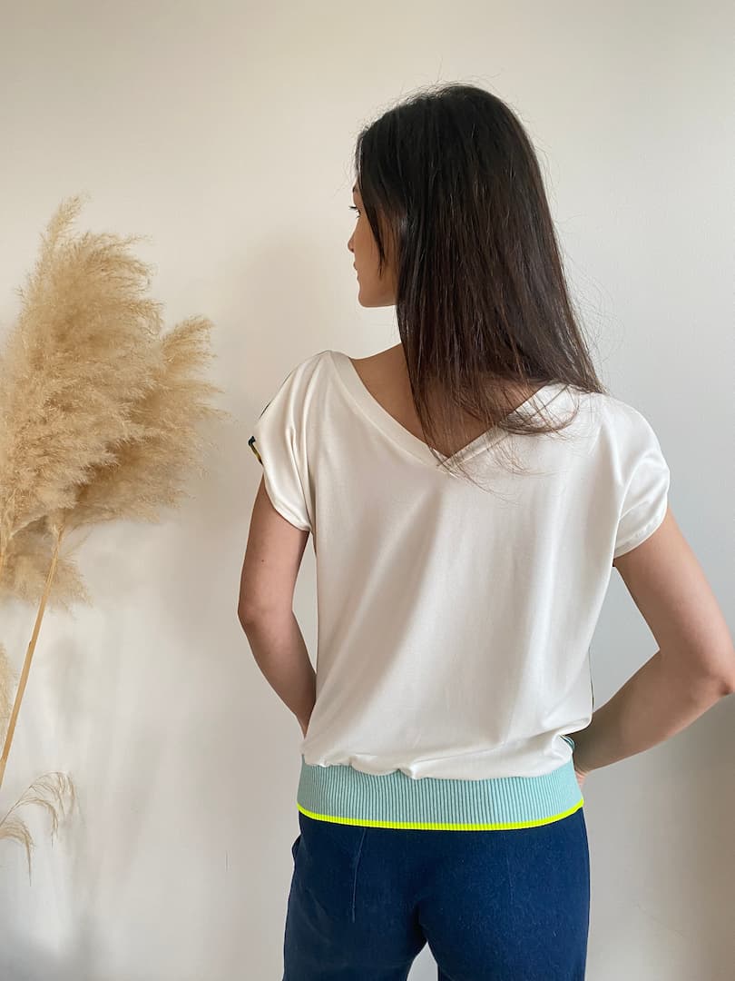 Turquoise, yellow, green flowered printed viscose combined with an off-white stretch viscose jersey top